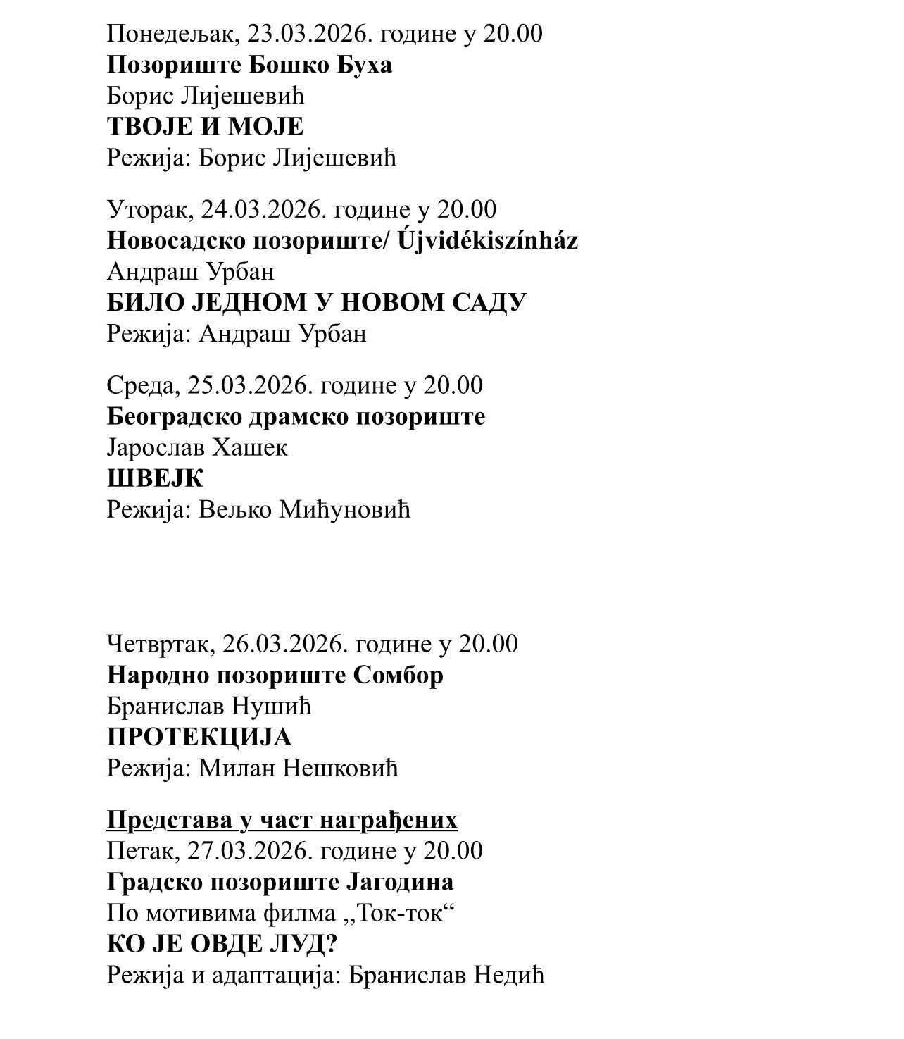 5. Tvoje i moje, autorski projekat i režija Boris Liješević, Pozorište Boško Buha.
